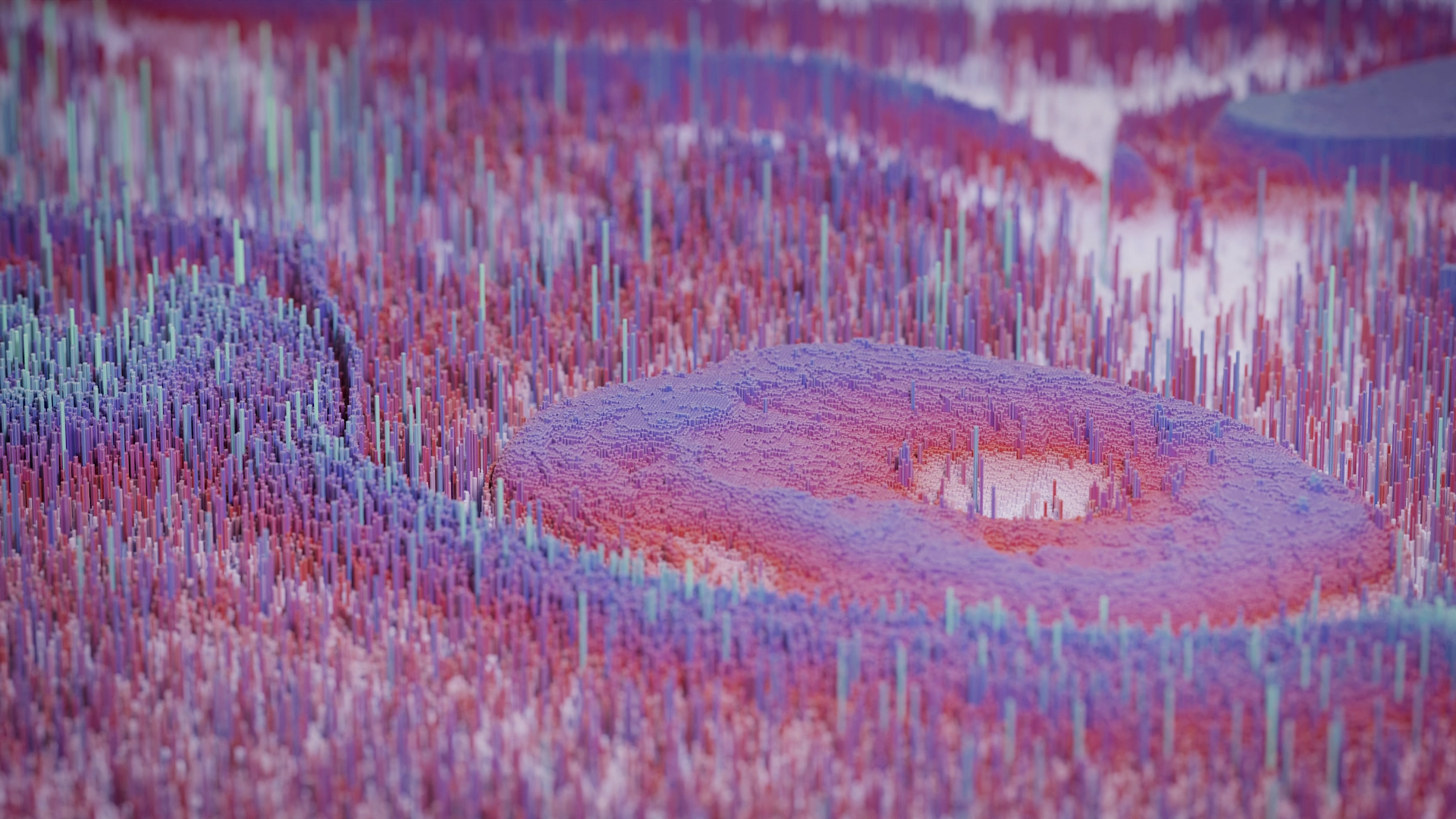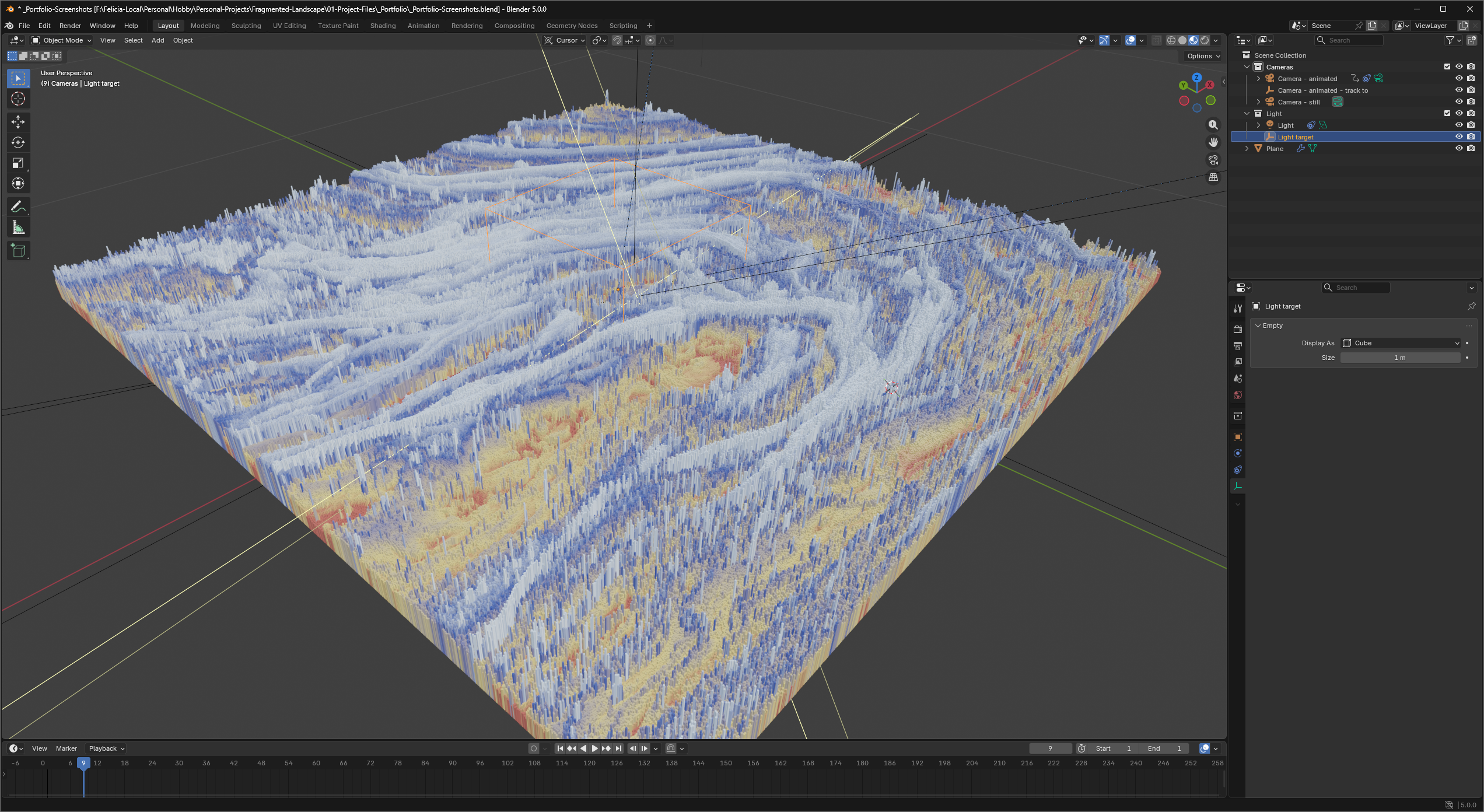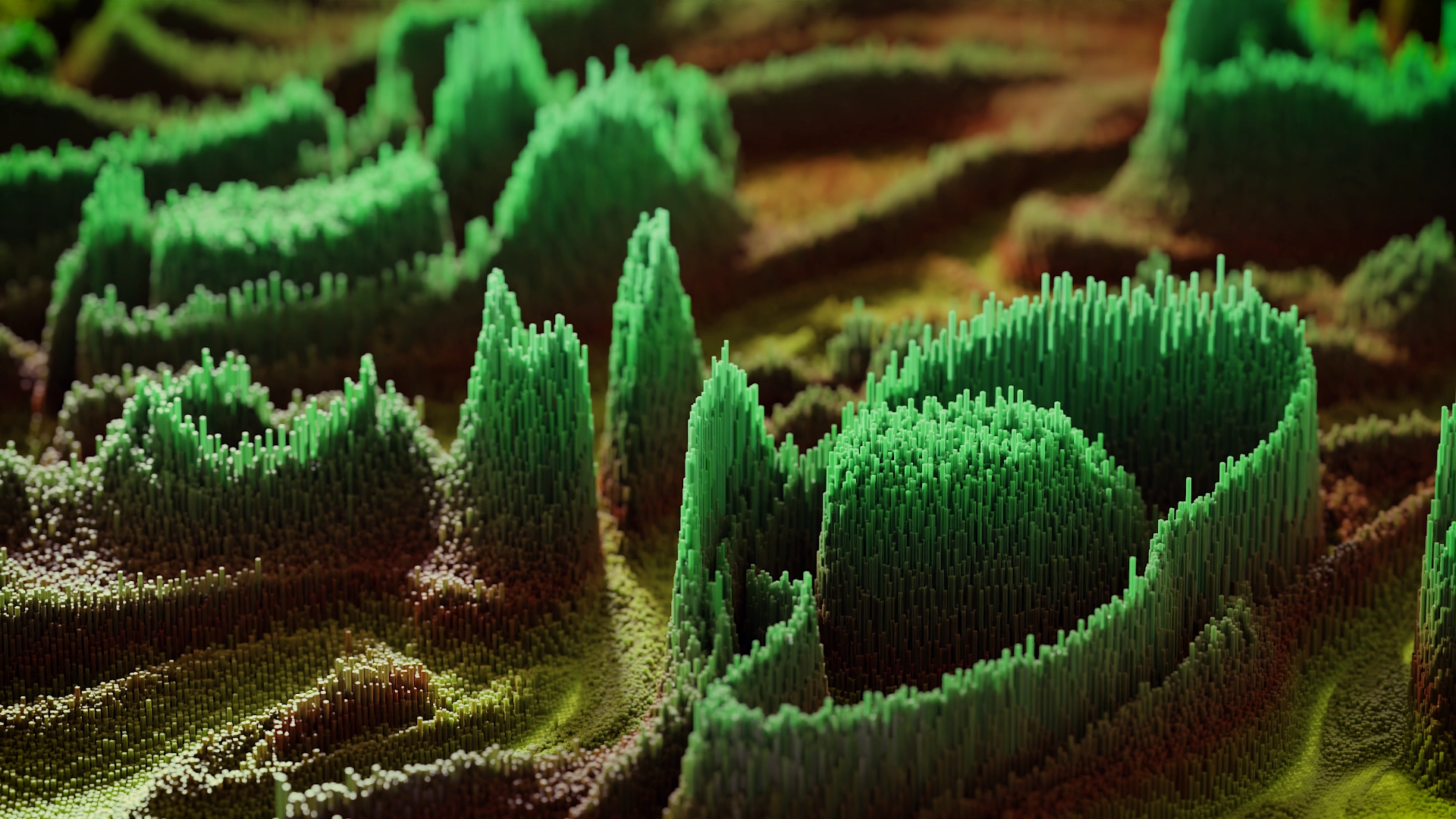 The terrain is built from a grayscale image used as a height‑map. The darkness of each pixel drives the Z‑axis elevation of thousands of instanced cubes via Geometry Nodes. I also added a slight random rotation to every cube to break up the uniform grid.