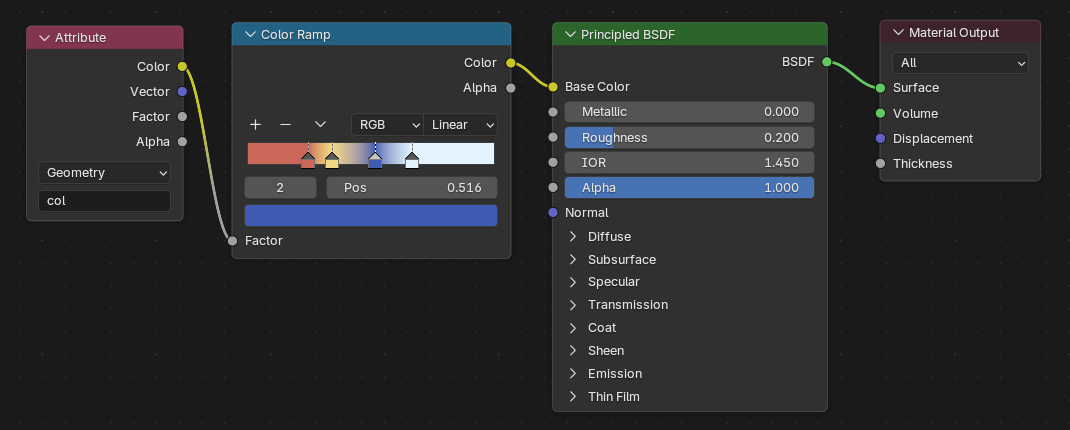 To colour the landscape, I passed the custom attributes (e.g., height and random seed) from the Geometry Nodes network into the shader graph, where they control the base colour, roughness, and other material properties.