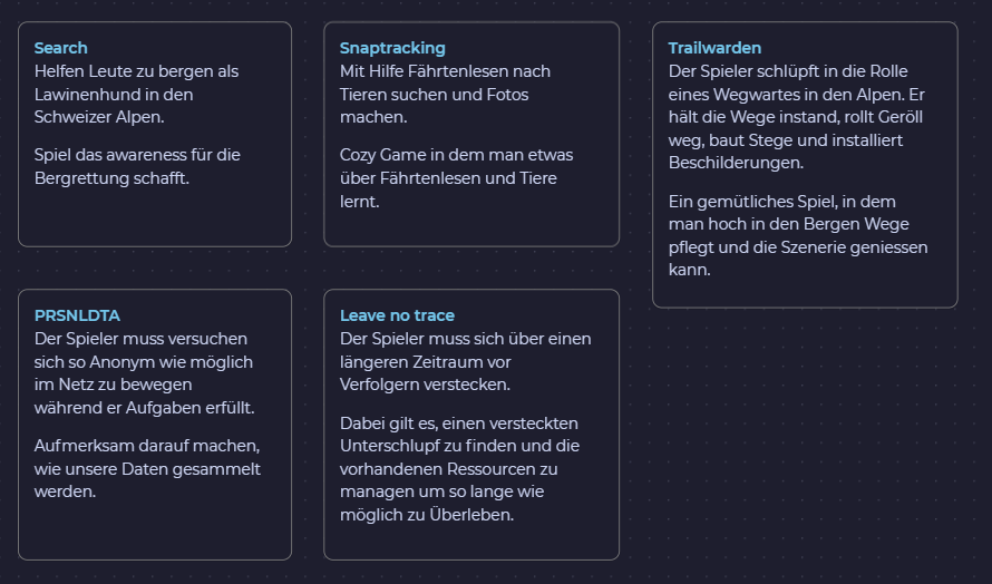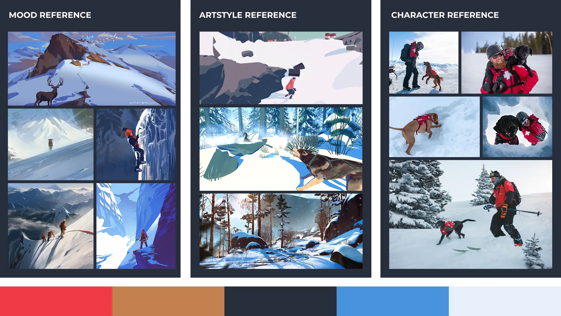 I researched both concepts for a bit and mapped out possible game loops. After a while I realized I wanted to go with "Search!". The partnership between humans and dogs felt fascinating, and the alpine landscape provides a stunning backdrop. This direction offers a clear narrative while avoiding the heavy UI work and technical research that the data‑security game would require.