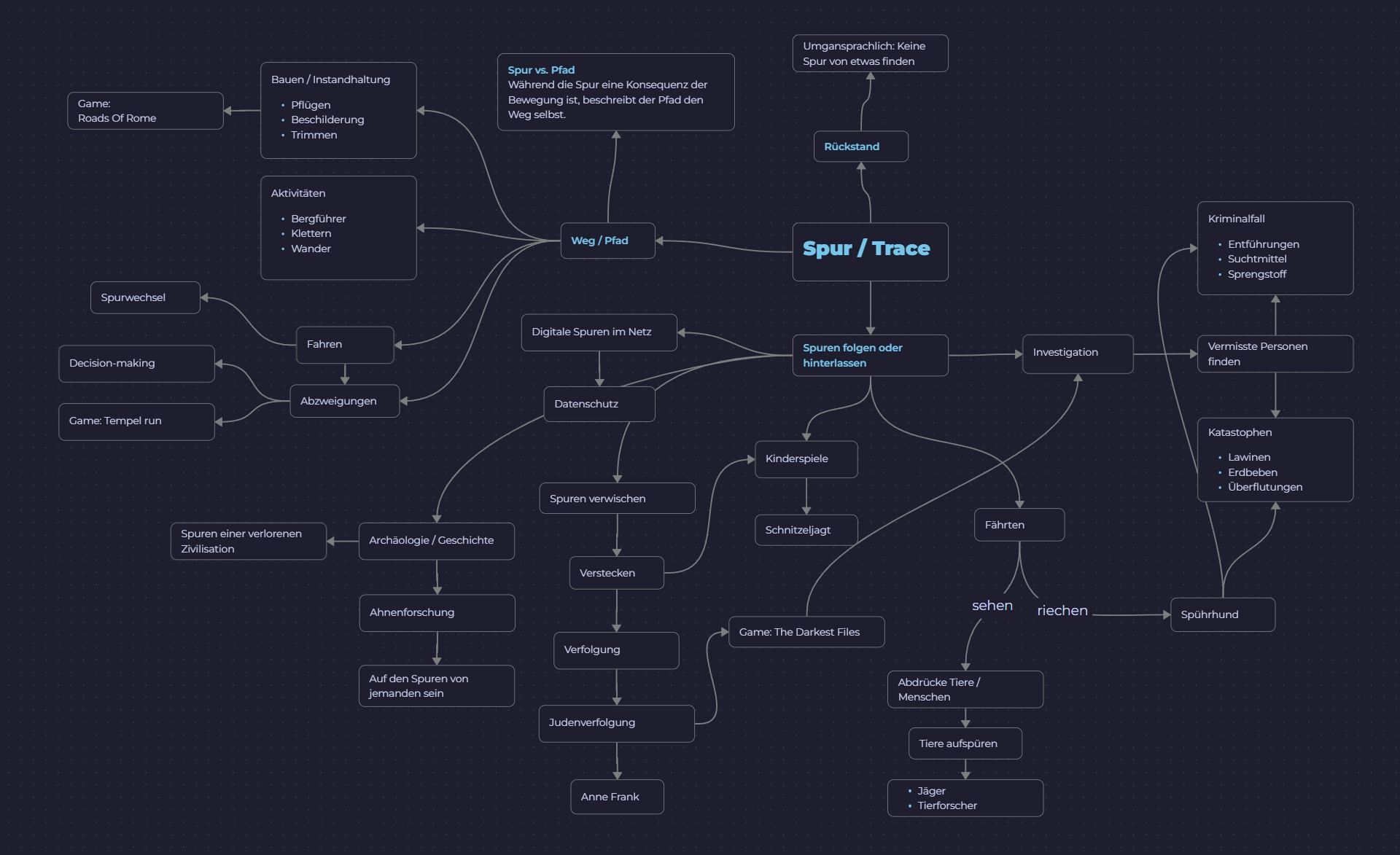At the beginning I started thinking: what even is a trace? A trace can be physical, like a footprint, a broken branch, or debris. It can also be abstract, like a scent or a sound. At its core, it is a small leftover that indicates something was present – a hint of information that can be followed, left, or hidden, with or without intention. You can also talk about traces literally meaning a path, such as one used for cross‑country skiing (Langlaufspur) or when driving (Fahrspur). But I felt that was farther from the core idea.