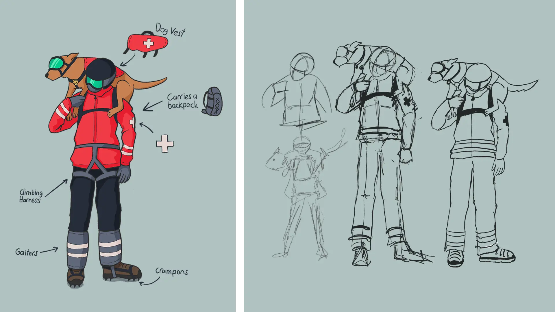 The handler is dressed for extreme cold and demanding vertical movement. Warm, insulated clothing, along with a protective helmet and goggles shield his head and eyes from wind and bright sunlight. An ergonomic backpack holds essential rescue tools. Because climbing is central to the gameplay, the handler also wears a climbing harness, gaiters that keep snow out of his boots, and crampons that bite into icy surfaces, ensuring he can ascend steep slopes and navigate treacherous terrain with confidence.