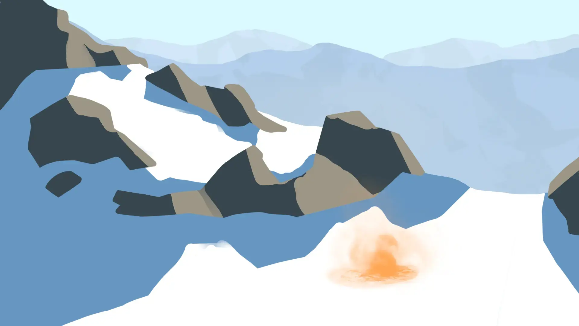 The game adopts a low-poly 3D aestetic. Cool hues dominate the snowy landscape, while the players are in warm, contrasting tones.