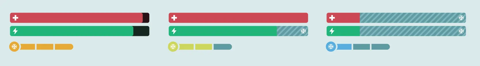 Characters need to monitor three stats: health, stamina, and body temperature. If body temperature drops too low, it begins to affect stamina and eventually the health bar, blocking part of the bar and preventing it from filling up completely.